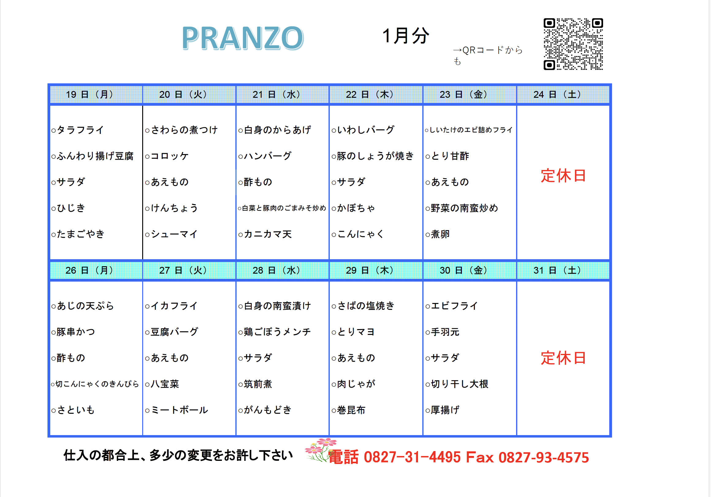 お弁当のメニュー表を随時更新しています。