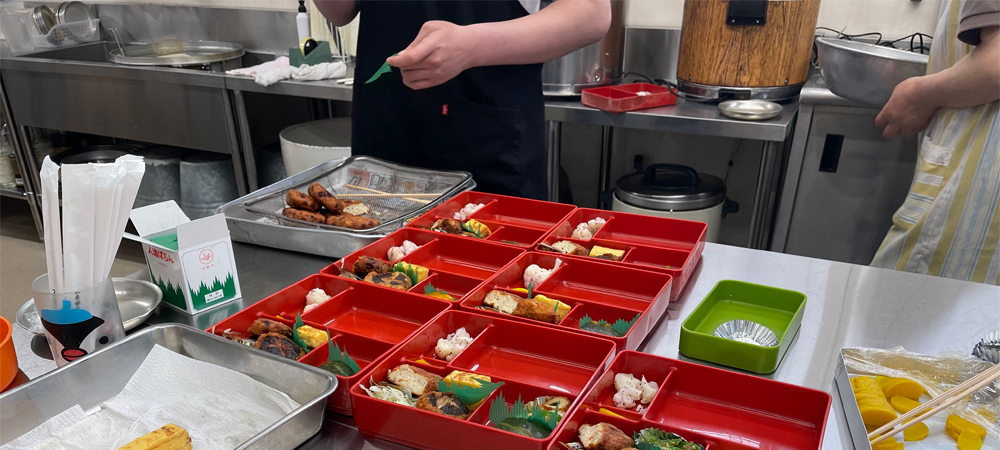 プランツォでは毎日でも食べられるお弁当を季節の食材を使い、彩り豊かに作っています。食材の準備から盛付け、配達から片付けまで、みなさまが得意なところで活躍しています。