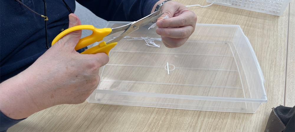 プランツォの施設内でお弁当業務だけでなく簡単な軽作業もしています。地域の企業さまからの下請け作業で、座って手元でできる内職作業をしています。