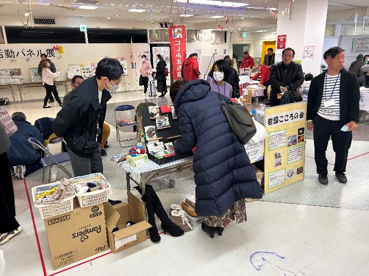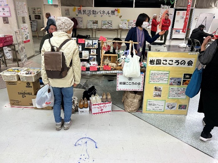 今年は1月25日にフジグラン岩国で市民活動カフェが開催されました。岩国こころの会は遊休品と手芸品の販売で出店させて頂きました。皆さまから頂いた遊休品や、ふぉんた~なの方たちが作ったかわいい手芸品、利用者のご家族の方が持って来てくださった手芸品が並びます。