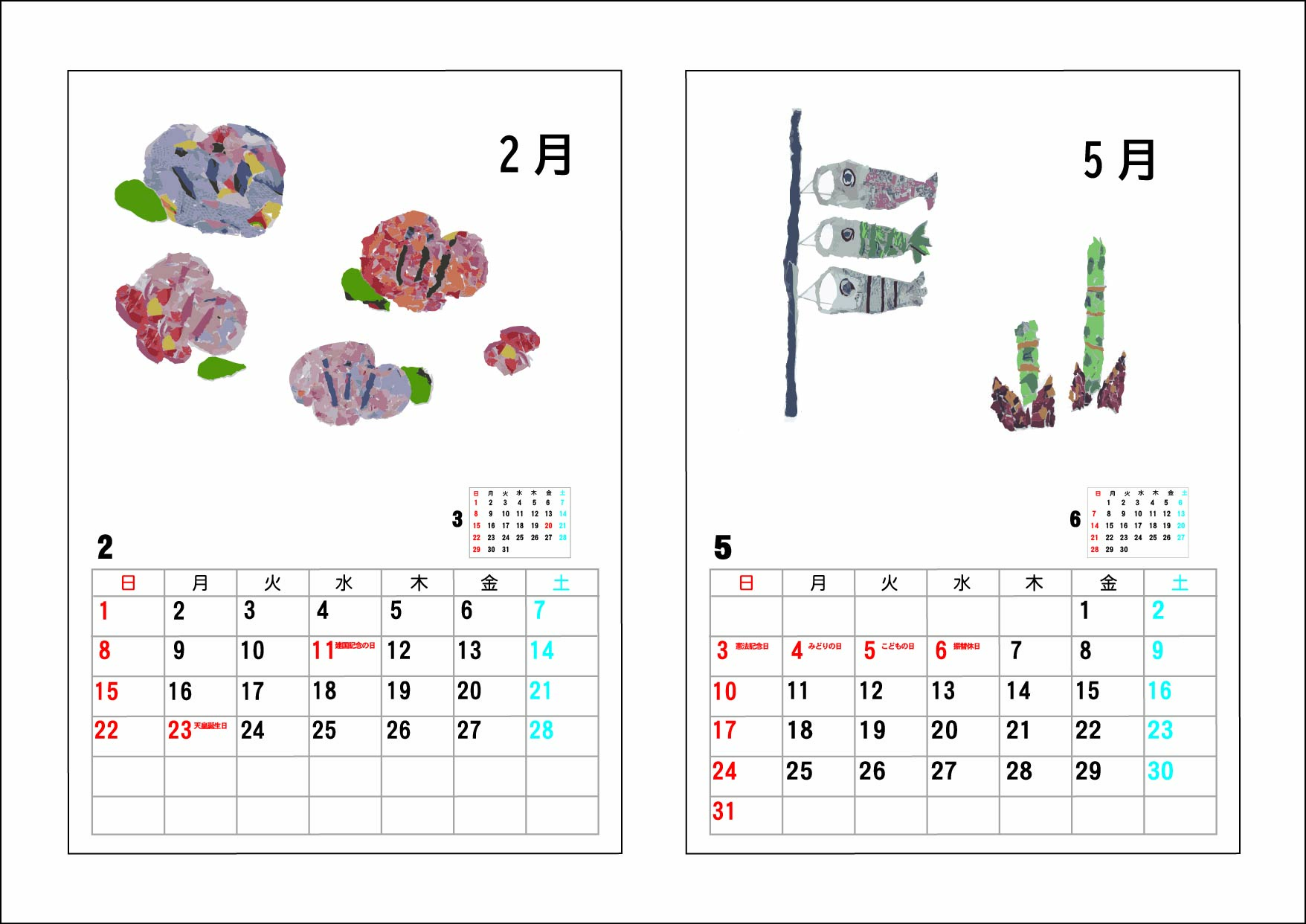 よこやま工房で試みています、紙すきの用紙を用いたカレンダーの試作品は、ふぉんた~なのメンバーさんが作成された「ちぎり絵」をイラストに使わせていただいています。